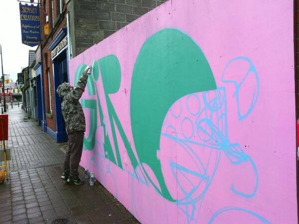 A boarded up site on Dublin Street is painted in preparation for the Giro d’Italia’s arrival in Dundalk on Sunday