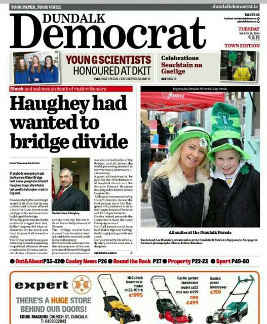 This week’s Dundalk Democrat leads with the death of local businessman Edward Haughey and his efforts to get the Narrow Water Bridge built. There’s also coverage of this year’s St Patrick’s Day parade in Dundalk and an interview with a local woman about her time on a trolley in Our Lady of Lourdes Hospital in Drogheda.